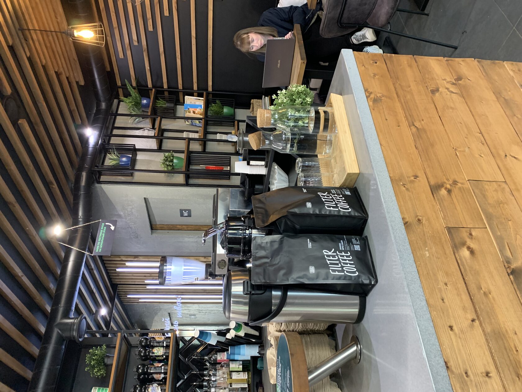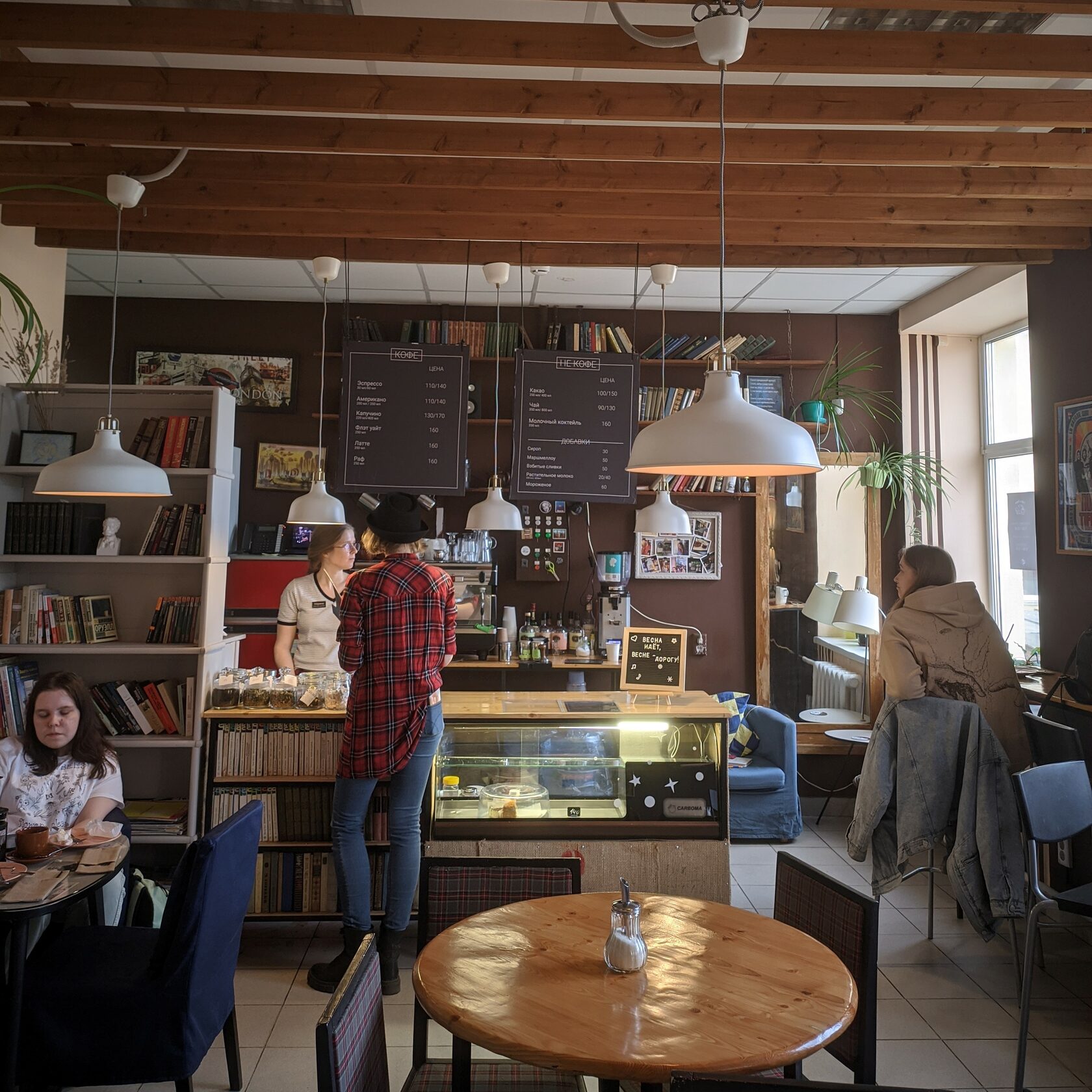 Напоследок я оставила самое сладкое — горький кофе. В «Cuprum» нет сиропов и Wi-Fi, зато есть шахматы и места на подоконнике. Хоть бариста и сказал мне, что к ним чаще приходят поработать, я бы с удовольствием пришла сюда отдохнуть с семьей или друзьями. Много мест, светло, деревянная мебель и растения, что ещё нужно для приятного выходного дня? Кстати, пока я решала, чем сходить: слоном или ферзём, за соседним столиком собрался целый книжный клуб. Человек десять пили кофе и бурно обсуждали какое-то произведение.