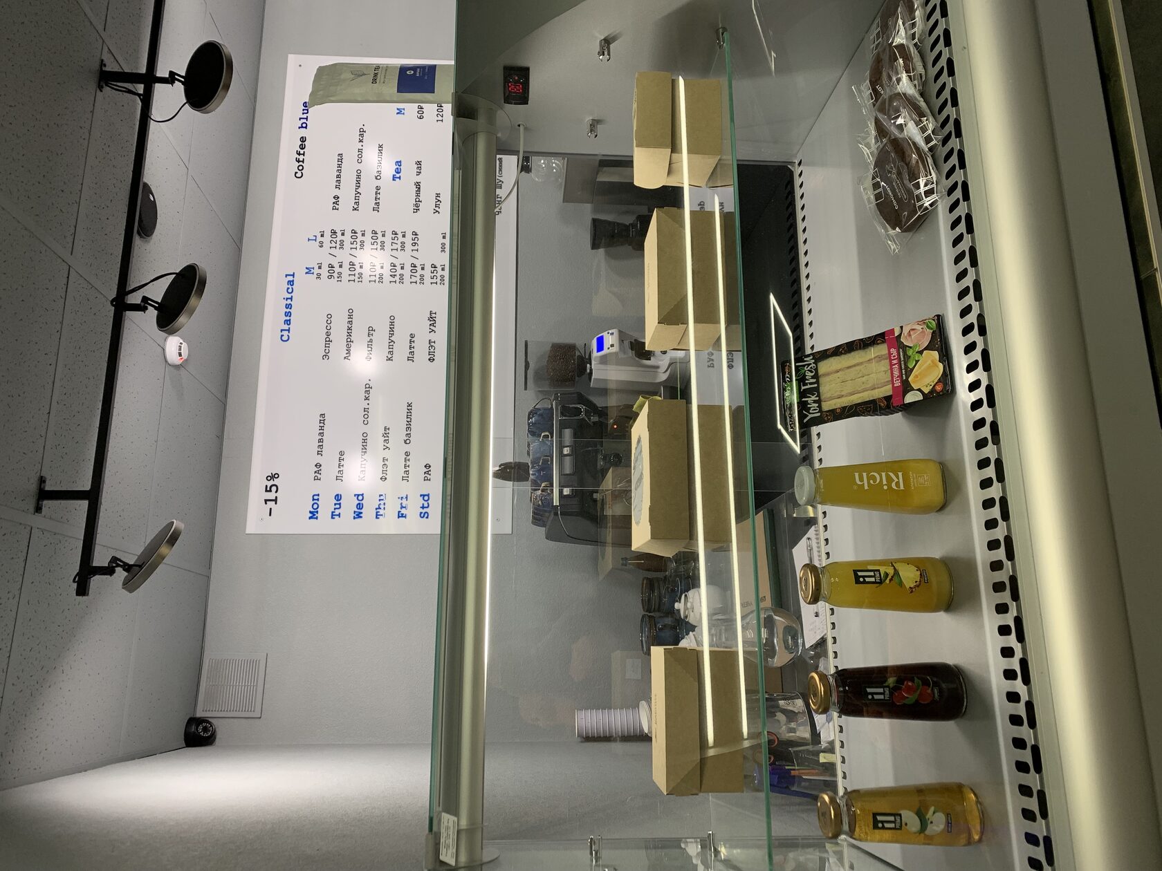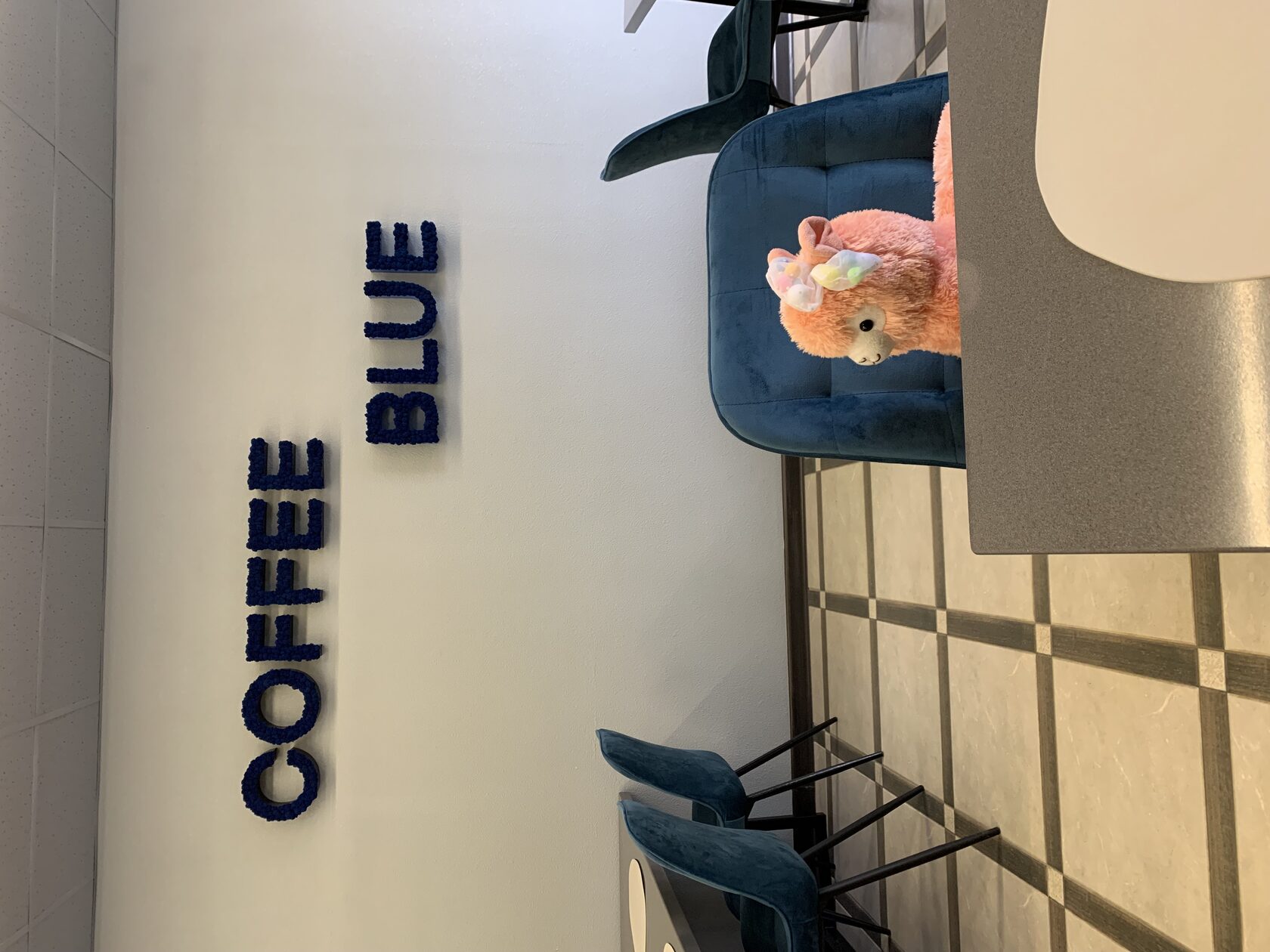 — Почему здесь никого нет? — Мы новая кофейня, о нас ещё мало кто знает. Могу сказать, что мне просто посчастливилось зайти в «Coffee blue» и открыть для себя это пространство. Здесь целых три зала. В первом — стойка выдачи заказов, зеркало во весь рост и «фотозона». Во втором — столы для больших компаний. В третьем — места для двоих и барная стойка с высокими стульями. Сейчас кофейне важно найти свою аудиторию, поэтому в ней проводятся кинопоказы, фотосессии, концерты местных групп и дни настольных игр. Если вы любите такие мероприятия, то вам нужно подписаться на группу кофейни ВКонтакте, где выкладывают расписание событий. А ещё в «Coffee blue» приятный бонус — студентам скидка 10%.