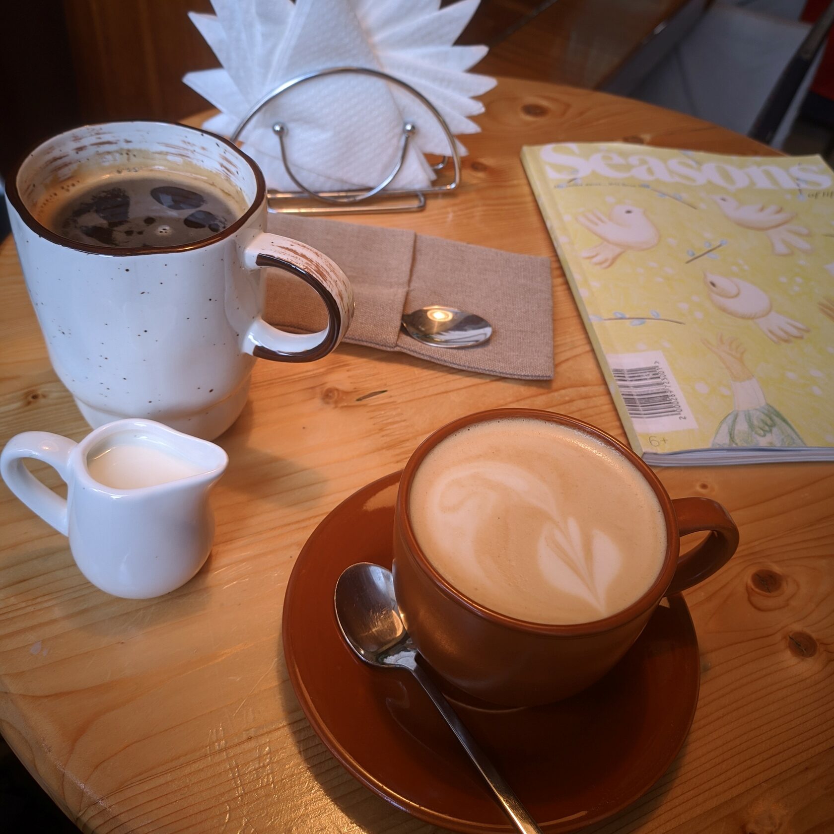Моё путешествие по кировским кофейням началось с Coffee Like в жилом комплексе Алые Паруса. Здесь царила по-настоящему рабочая атмосфера: щёлкали клавиши, в разговорах мелькали слова «реклама» и "контент-план", шуршали страницы толстых ежедневников. Я решила, что тут точно всё для людей, когда заметила на подоконнике две корзиночки: с зарядками для телефонов и с раскрасками. Подкупили меня и пледы, аккуратно свёрнутые и дожидающиеся холодных вечеров. Ещё мне понравилось само пространство: высокие потолки, панорамные окна и интерьер в светлых оттенках. Я удивилась, когда узнала, что здесь можно заказать не только кофе с десертом, но и полноценный завтрак или обед. В продаже есть творожные запеканки, сырники, каши, тосты и супы… Делая заказ, разговорилась с бариста и узнала, что девиз их компании «100% довольный гость». Я, не задумываясь, проговорила: «Я ваш довольный гость!»